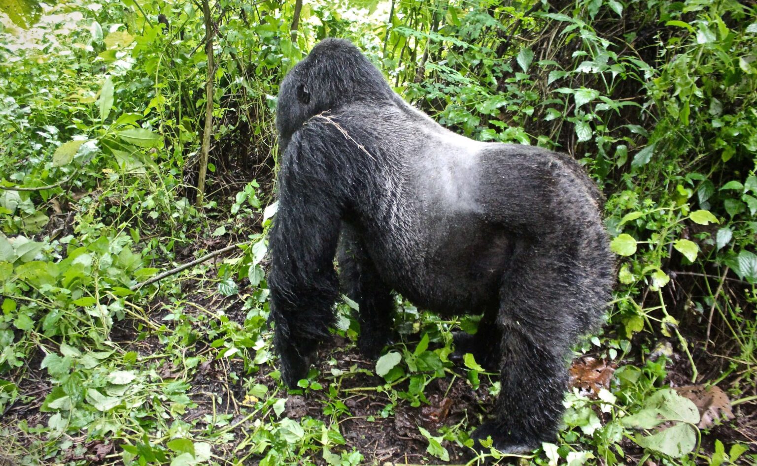 Po chvíli ukazujú do húštiny, kde sa kŕmi ďalšia dospelá gorila. My turisti sa držíme v skupinke a nemo s úžasom pozeráme na tieto neopísateľné tvory z tesnej blízkosti (Číňanka odušu fotí, prihovára sa gorilám v Mandarínčine a natáča videá) a ostatní rangeri sa rozpŕchnu a hľadajú veľkého samca gorily so striebristou srsťou na chrbte, tzv. „Silverback-a“. O chvíľu ho nájdu a volajú nás k nemu. Je asi o tretinu väčší ako dospelé samice a má výraz tváre, ktorý vyvoláva rešpekt. Ale asi len v západnej kultúre, pretože Číňanka k nemu nebojácne pristupuje bližšie, aby si ho odfotila. Ranger ju slušne upozorní, aby dodržiavala odstup. Boss Jeremy nám vysvetľuje, že gorilím samcom sa vo veku 15 rokov srsť na chrbte sfarbuje z čiernej na striebornú a podľa nej aj tento druh goríl nesie svoj názov.